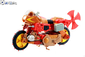 His accessories include three rifles, a battle axe, a television, and two pegs. The rifles are nicely detailed with metallic silver highlights. They use Masterpiece style tabs that work well with his hands. They also have pegs on the sides to plug into various ports on his body. The battle axe is several pieces of colored plastic. The head of the axe detaches, leaving him with a stick for banging on the drum piece that comes with Dumpyard. There are various parts all over the bike for attaching the axe head and rifles. The television has some cleanly applied paint details and fits nicely in his hands or the saddlebags at his hips.